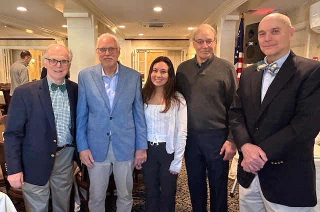 Left to right: Kevin Thomas Plodzik, Board President; Charlie W. Dee, Jr.; Madeleine Clancy; Tom Nelson, Chair, Wright Tavern Trust and introducer of Madeleine; John Gardella, Board Vice-President and introducer of Charlie.
